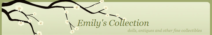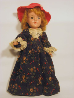 The doll is wearing a dark blue, flowered corduroy full-length dress with lace at the collar and cuffs. Her red hat is a felt material, but is spotted and worn looking.