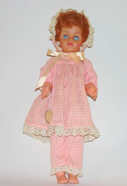 Cute Ideal character doll - 14 and 1/2" tall. Her adorable green eyes open and close, and she has movable arms and legs. Her tiny pink fingernails and toenails are painted pink.